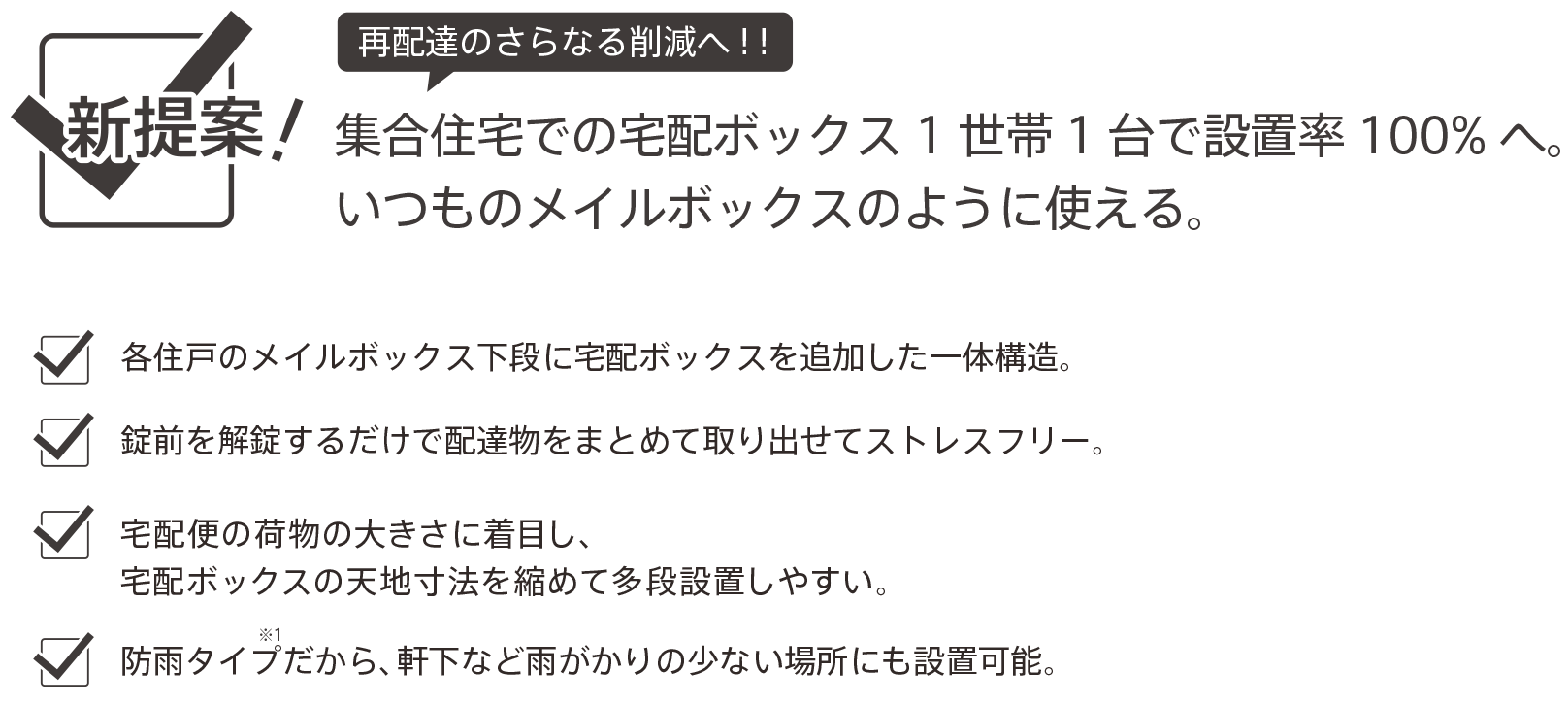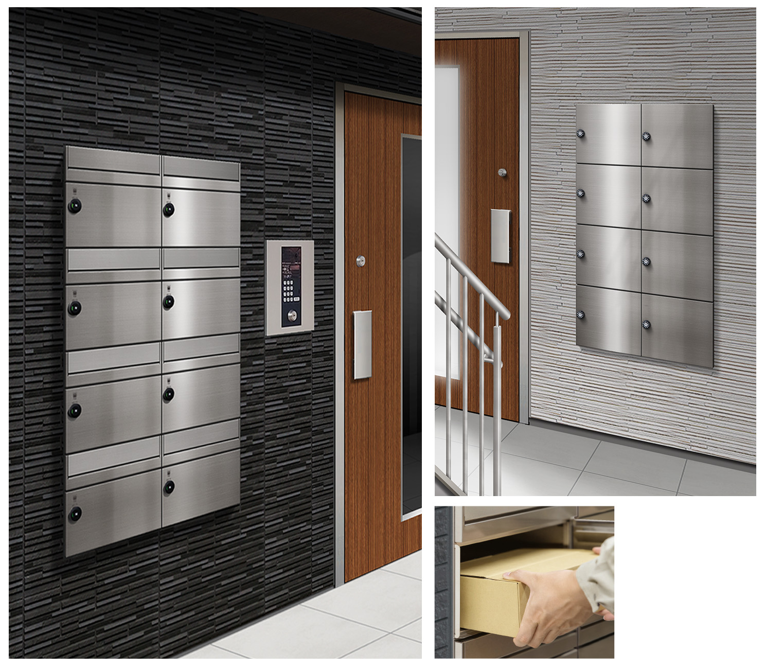 これらの問題に対するタジマの答えは、各住戸に宅配ボックスを設けること。