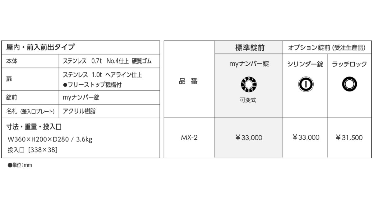 商品検索 用途から探す 設置場所集合住宅用戸建住宅用設置方法前入前出前入後出設置場所屋内屋外可扉の開き方向ヨコ開き引上げ勝手違い開閉音考慮型投函可能サイズ角2封筒角3封筒大型郵便ボックスサイズ(1扉H/mm)~100~120~150~200~300~400401~価格(1扉/円)〜10,000〜20,000〜30,000〜50,000〜100,000〜150,000150,001〜 品番から探す キーワードで探す TOP > 商品 > MX-2 MAILBOX郵便受箱 MX-2 引上げ扉方式ユニットタイプ 仕様・機能 集合住宅用 前入前出 引上げ扉 myナンバー錠 角2封筒 ヘアライン ~H200 ~¥50,000 BL 説明 何列・何段でも組み合わせ自由です。引き上げ式扉で郵便物の取り出しが容易です。 ステンレスと黒色ゴムの採用で出入口を演出します。 角2封筒が収納できます。(グッドデザイン賞受賞品) 標準仕様 / 価格(税抜価格) 詳細図 ダウンロード 取付説明書取扱説明書図面/CAD図面/PDF