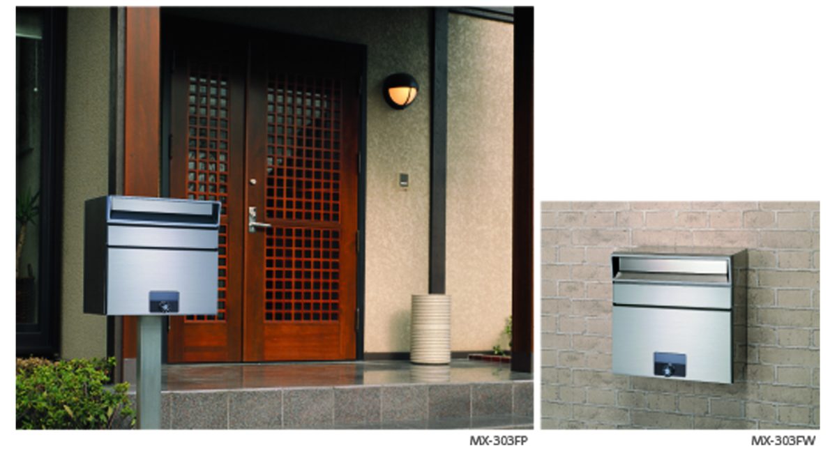 前入れ前出しの戸建て住宅用郵便受けです。ポール付タイプ(MX-303FP)と壁付タイプ(MX-303FW)があります。標準錠前はmyナンバー錠です。大型化する郵便物や大量の新聞にも対応できる大容量です。扉は、ステンレスヘアライン仕上げです。扉に付いた小窓から一目で郵便物の有無がわかります。