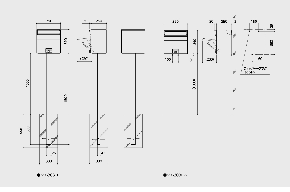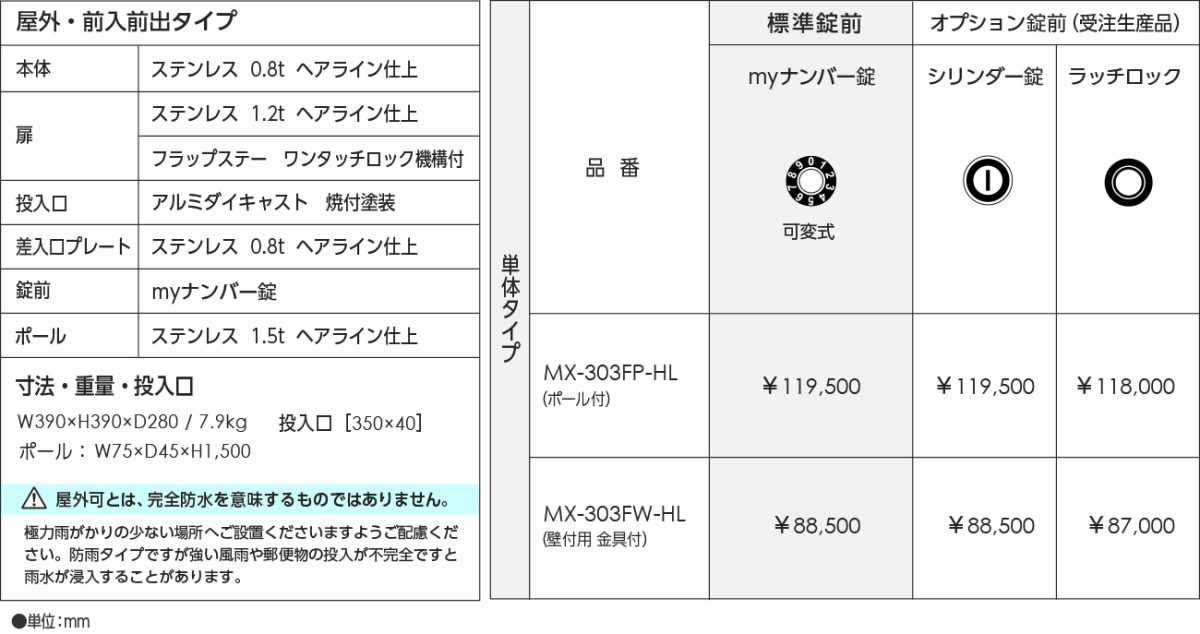 前入れ前出しの戸建て住宅用郵便受けです。ポール付タイプ(MX-303FP)と壁付タイプ(MX-303FW)があります。標準錠前はmyナンバー錠です。大型化する郵便物や大量の新聞にも対応できる大容量です。扉は、ステンレスヘアライン仕上げです。扉に付いた小窓から一目で郵便物の有無がわかります。