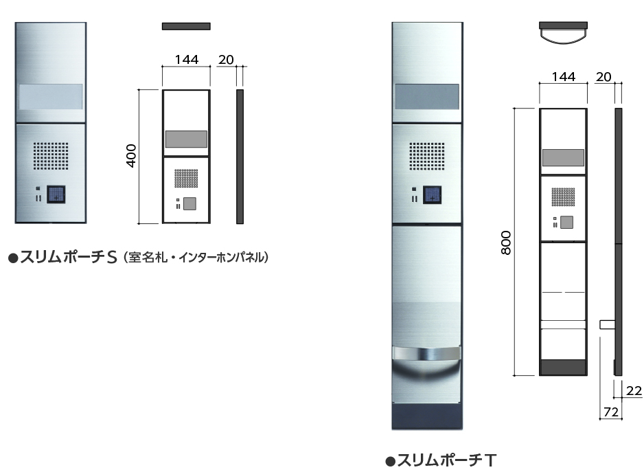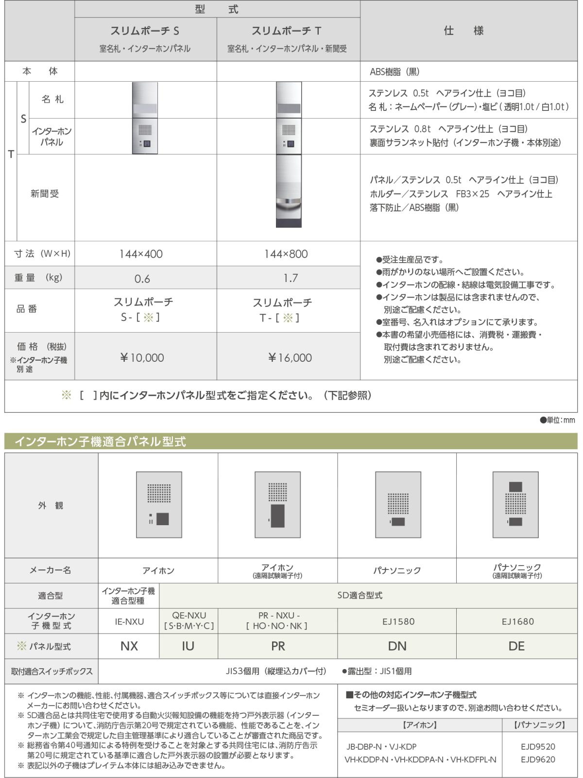 商品検索 キーワードで探す TOP > 商品 > スリムポーチ PLATEMマンションプレート システム スリムポーチ ステンレスと黒色樹脂のコンビネーション 説明 ◎室名札・インターホンパネル・新聞受等をトータルにコーディネートします。 ◎ステンレスと黒色樹脂のコントラストが、スタイリッシュで機能的な玄関を演出します。 ◎一体型のスリムポーチTのほか、セパレート型のスリムポーチSは、単体で設置することが可能です。 ◎後付けタイプのプレートシステムで、リフォームに最適です。 ◎パネル面は、メンテナンス性に優れたステンレス製のヘアライン仕上です。 標準仕様 / 価格(税抜価格) 詳細図 ダウンロード 取付・取扱説明書取付・取扱説明書図面/CAD図面/PDF